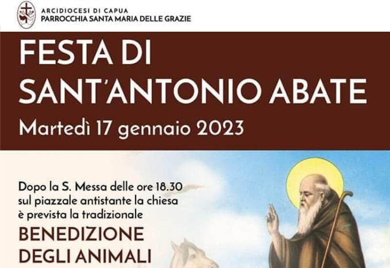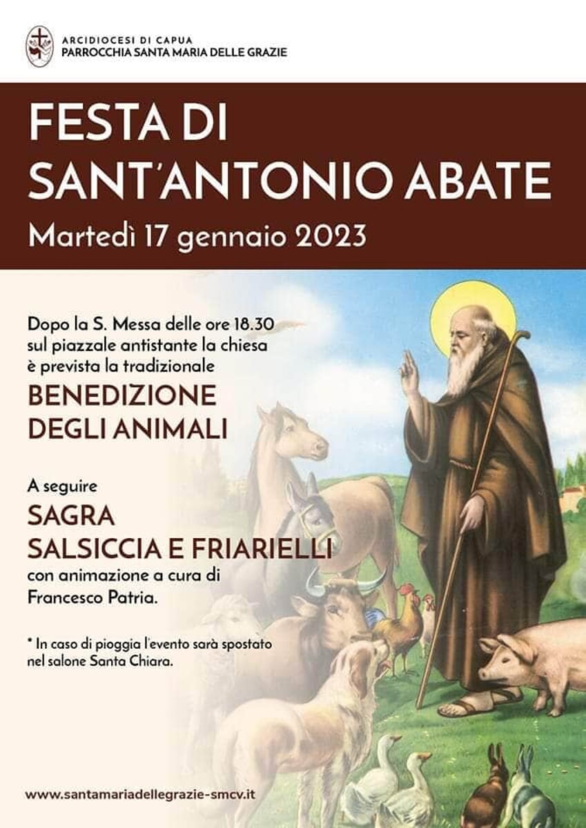 Martedì 17 gennaio, dopo la celebrazione della Santa Messa delle ore 18:30, sul piazzale antistante la Chiesa dedicata alla Vergine delle Grazie si terrà la tradizionale Benedizione degli animali. A seguire Sagra della Salciccia e Friarielli con animazione a cura del cantante, attore e regista teatrale Francesco Patria.