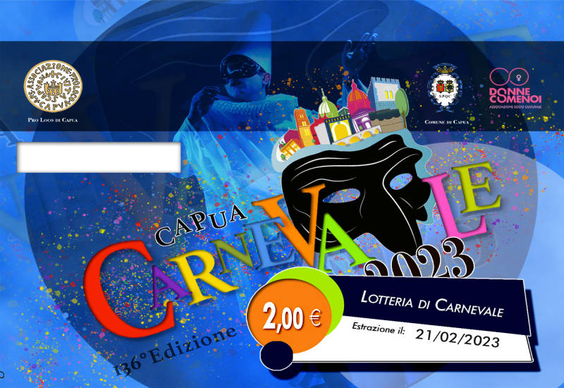 L’Agenzia delle Accise, Dogane e Monopoli, verificata la correttezza della pratica presentata dalla Pro Loco di Capua, ha autorizzato la storica associazione allo svolgimento della manifestazione di sorte locale. La Pro Loco, a lavoro per allestire la 136° edizione del Carnevale, manifestazione a cui tutta la comunità è particolarmente legata, ha dunque organizzato una lotteria locale.