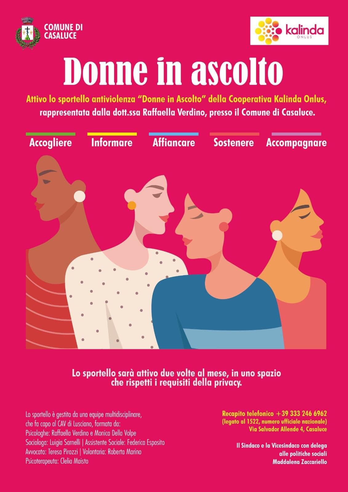 Gestito da un’equipe multidisciplinare che fa capo al CAV di Lusciano, lo sportello sarà attivo due volte al mese con il compito di accogliere, informare, affiancare, sostenere e accompagnare le donne vittime di violenza, in uno spazio che rispetti i requisiti della privacy.