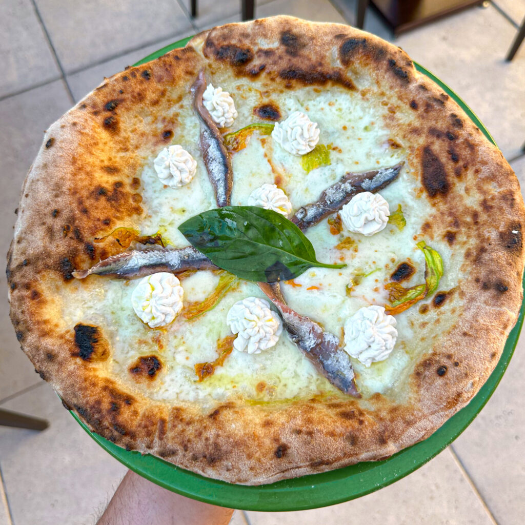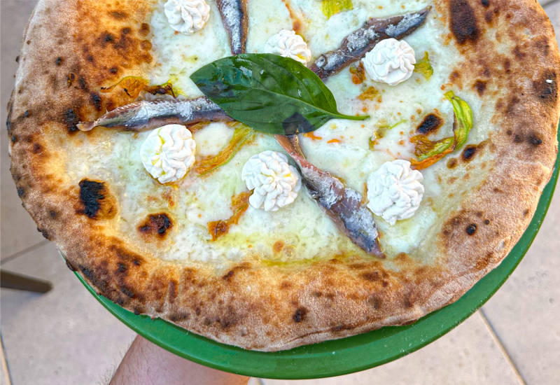 All’uscita dal forno alici di Cetara, ricotta di bufala ed olio extravergine d’oliva “Oro di Caiazzo”, altra bontà del nostro territorio. Assai apprezzato in questo periodo estivo, o ciurillo, come è detto il fiore di zucca in lingua napoletana, è un ingrediente molto utilizzato in cucina e decisamente accattivante con i suoi colori accesi, donato dalla terra, o megliodalle zucche. Sulla tavola di primavera e d’estate i fiori di zucca sono un alimento che non può mai mancare: fritti in pastella, al forno ripieni, con la pasta o anche, come li ha utilizzati Daniele, sulla pizza, sono un canto ammaliante di Circe per i palati e le gole a cui è difficile veramente resistere. I fiori di zucca sono ricchi di acqua, fibre, antiossidanti, carotenoidi, sali minerali, B-carotene, luteina e si mangiano con gusto e piacere, contravvenendo alla regola secondo cui non solo i più piccoli ma anche tanti adulti non amerebbero particolarmente cibarsi dei prodotti dell’orto.