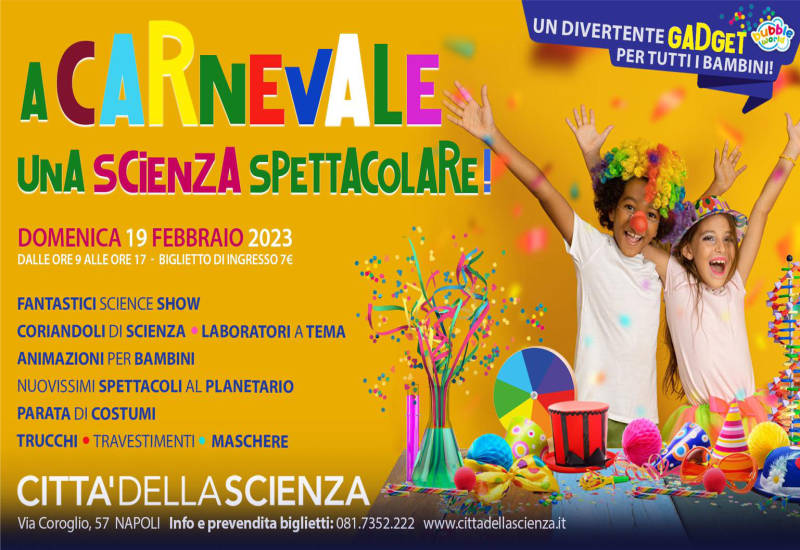 Domenica 19 febbraio 2023 dalle ore 09:00 alle ore 17:00 Città della Scienza ospita la Grande Festa di Carnevale, attesissimo evento per grandi e piccini.