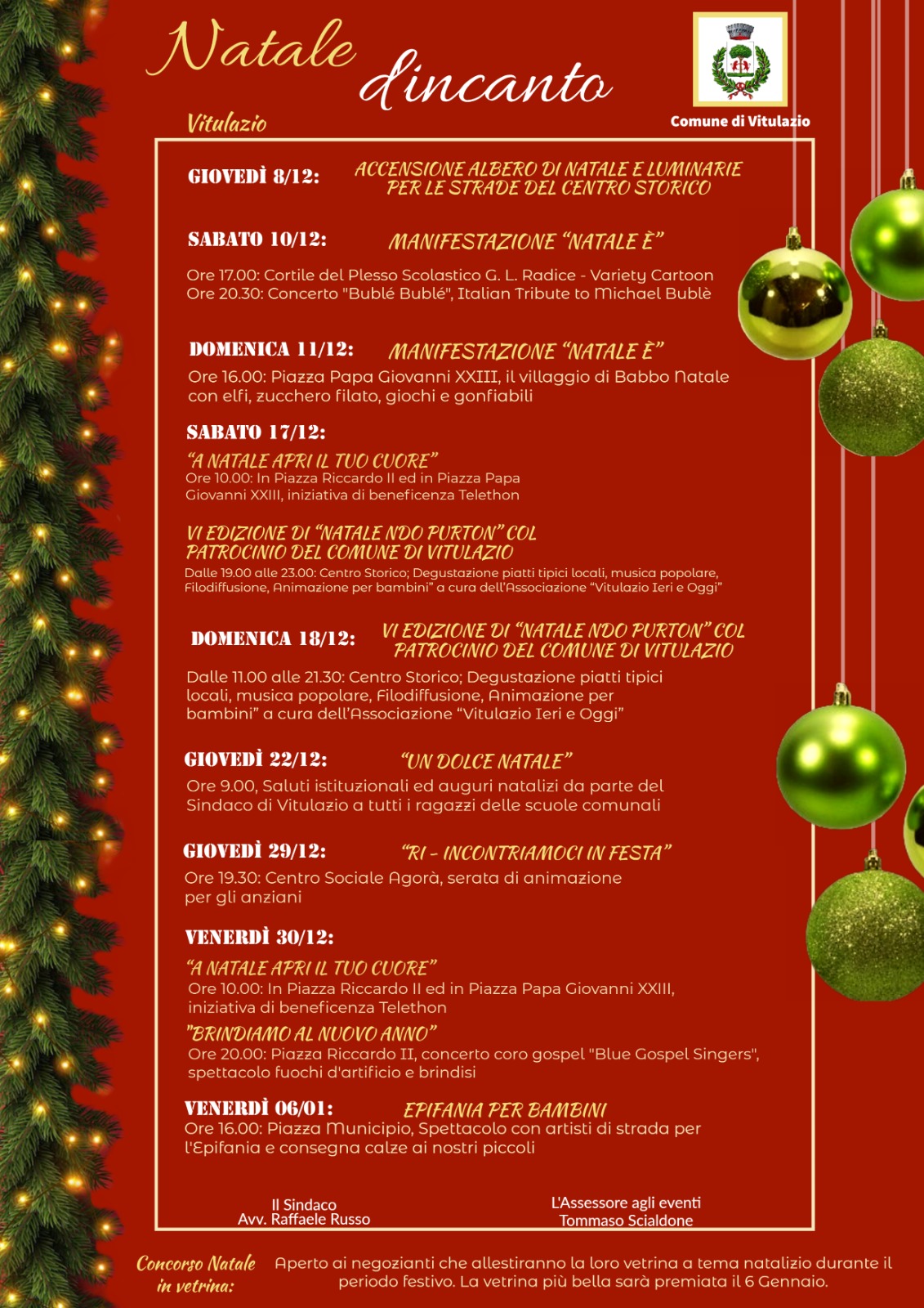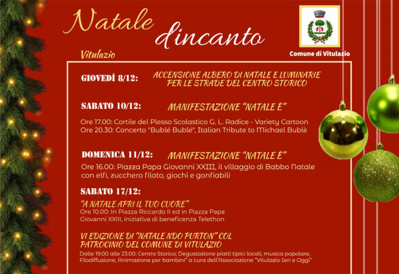 Pronto il ricco calendario di eventi allestito per il periodo natalizio a Vitulazio. Si inizia con la tradizionale accensione dell’albero di Natale e delle luminarie per le strade del centro storico prevista per il giorno 8 dicembre.