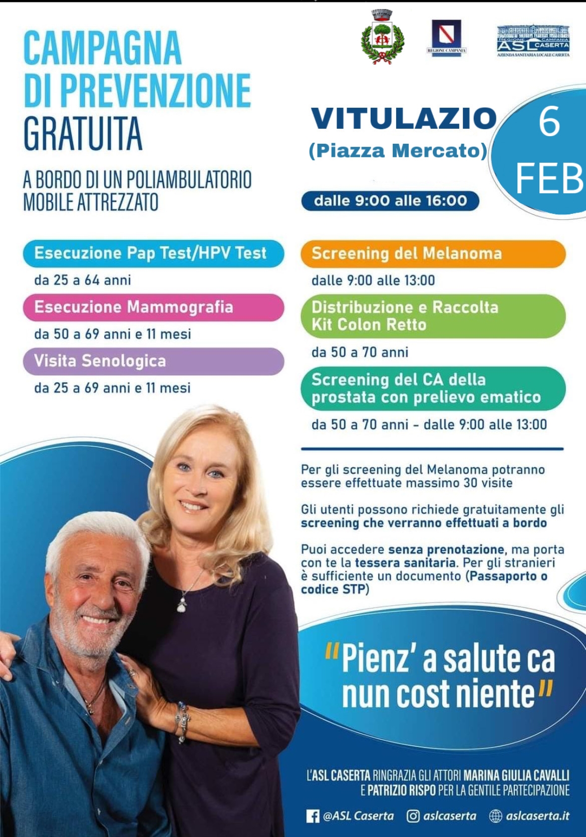 Screening oncologici in tour Il Comune di Vitulazio aderisce alla campagna di prevenzione gratuita promossa dall’ ASL Caserta e della Regione Campania.